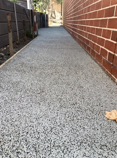 A 7mm stone set in a grey cement base creates a simple, classic look and is also available in different colours. This type of finish uses pervious concrete, which is made from single-size aggregates with little to no fine materials like sand. The cement paste binds the aggregates together, forming a stable yet porous structure that allows water to pass through, making it ideal for sustainable construction.